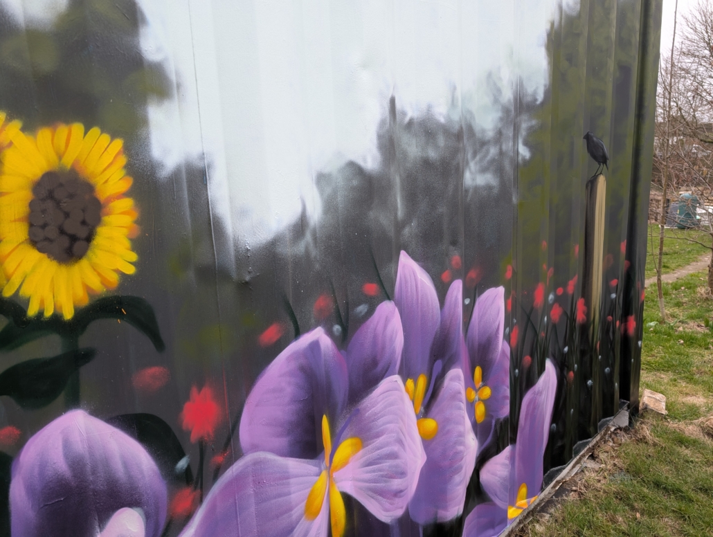 The site was a patch of unused land beside the Community Education Centre and is now a space to share and gain knowledge, grow food, native flowers that benefit wildlife, and improve social links for people. A wildflower meadow and wide areas of plants have been created, while the fruit and vegetables are grown for local residents and also supply the Community Fridge.