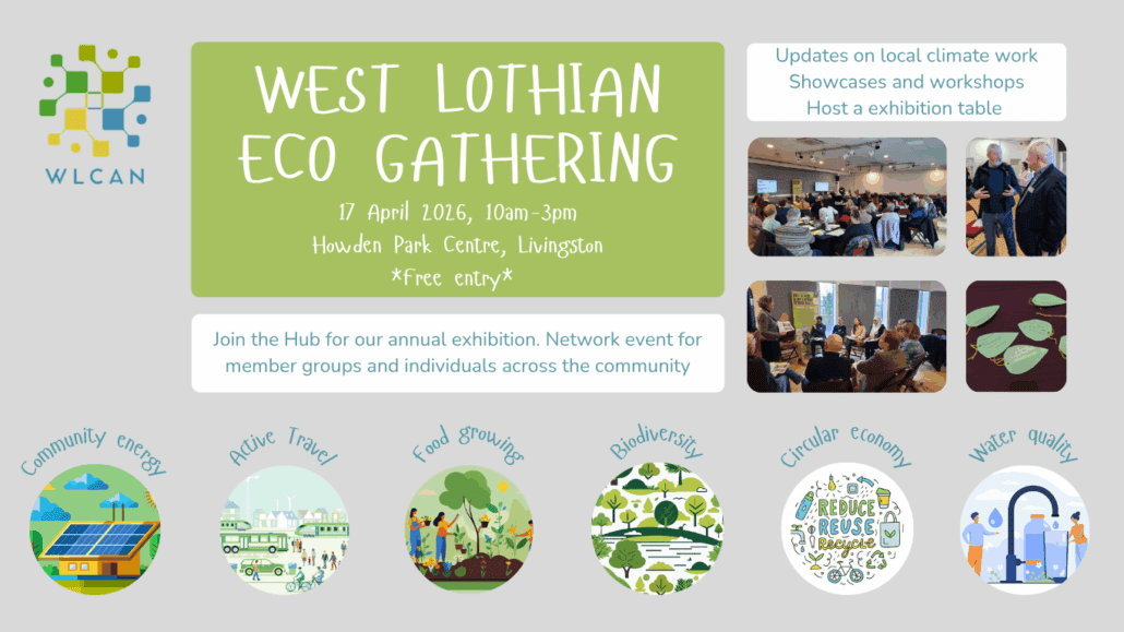 We’re looking forward to bringing all our group and individual members together for the third West Lothian Eco Gathering. This will be a chance to meet diverse community organisations all doing something, large or small, to improve West Lothian’s environment, natural resources and amenities for those living and working here.